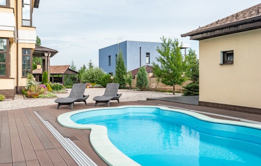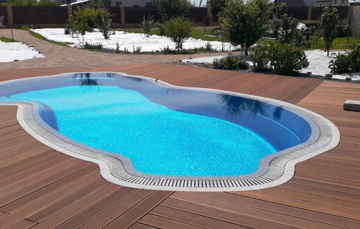 Бассейн продуман до мелочей: встроенная лестница обеспечивает комфортный вход, подводные сидения и поручень безопасности добавляют удобства, а переходящая глубина делает бассейн универсальным для всей семьи — от детей до взрослых.