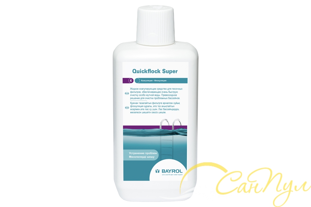 Жидкое средство для удаления взвесей в воде бассейна. Надежный помощник в борьбе за чистоту и прозрачность воды в бассейне. Вводится через скиммер. Квикфлок Супер усиливает действие песочных фильтров. Жидкость экономична в использовании и действует независимо от температуры воды и способов дезинфекции воды.